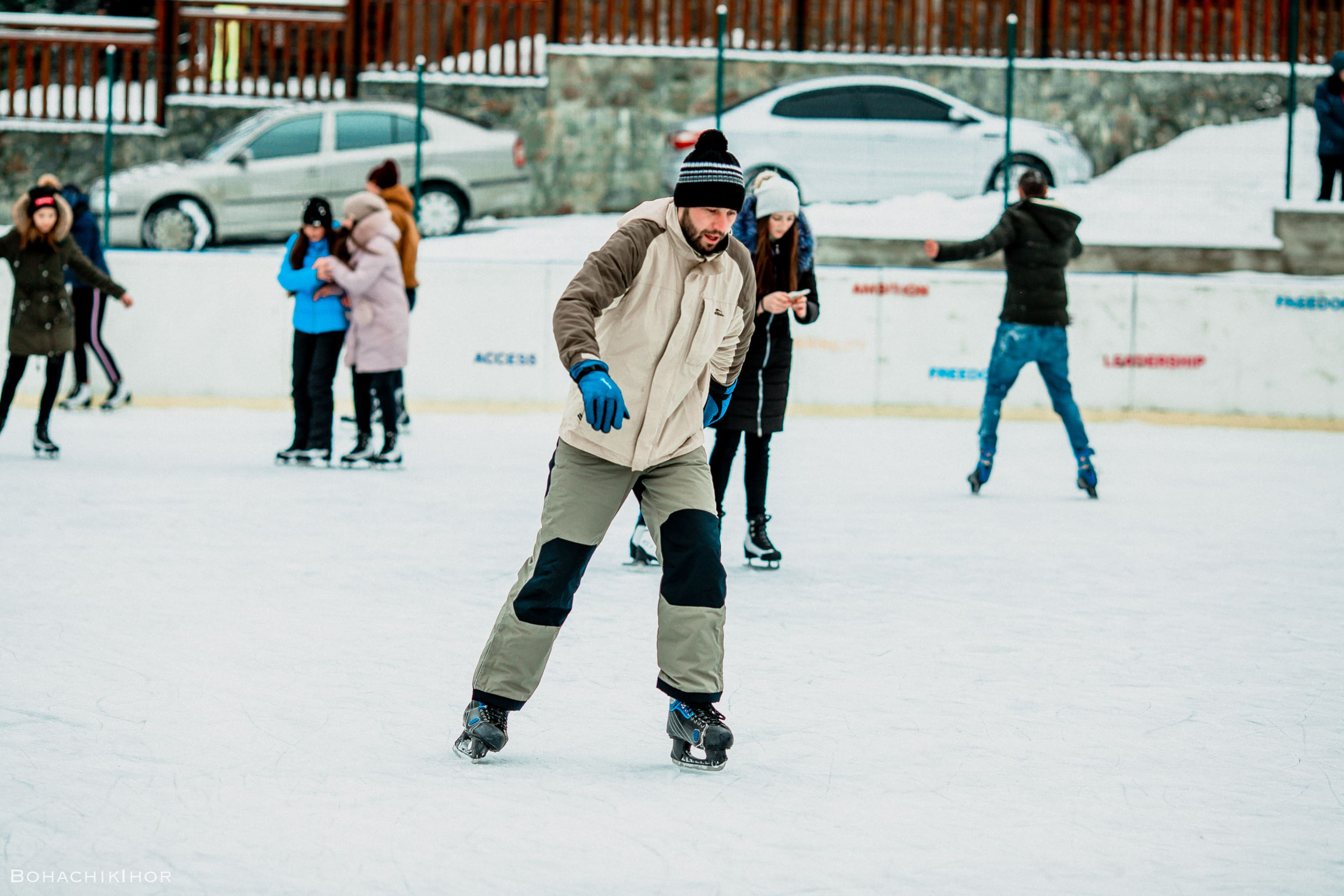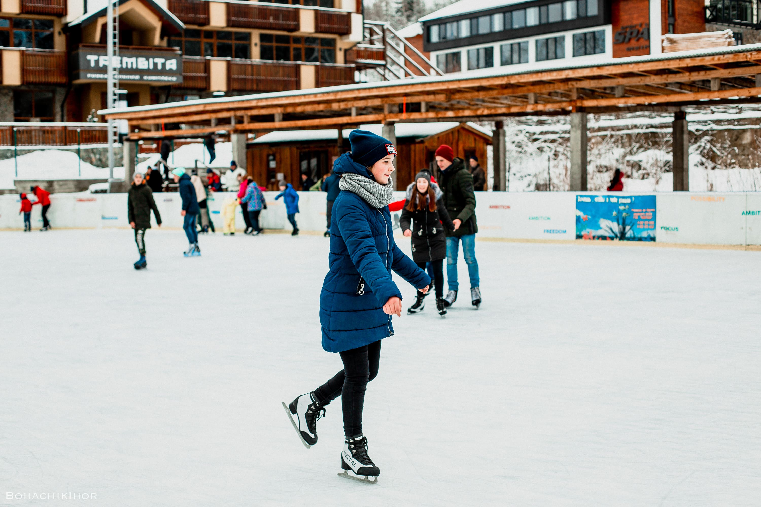 Майданчик достатньо просторий для комфортного катання, а бортики забезпечують безпеку для початківців. Ввечері тут панує особлива магія: вмикається ілюмінація та приємна музика. Ковзани входять у вартість квитка.